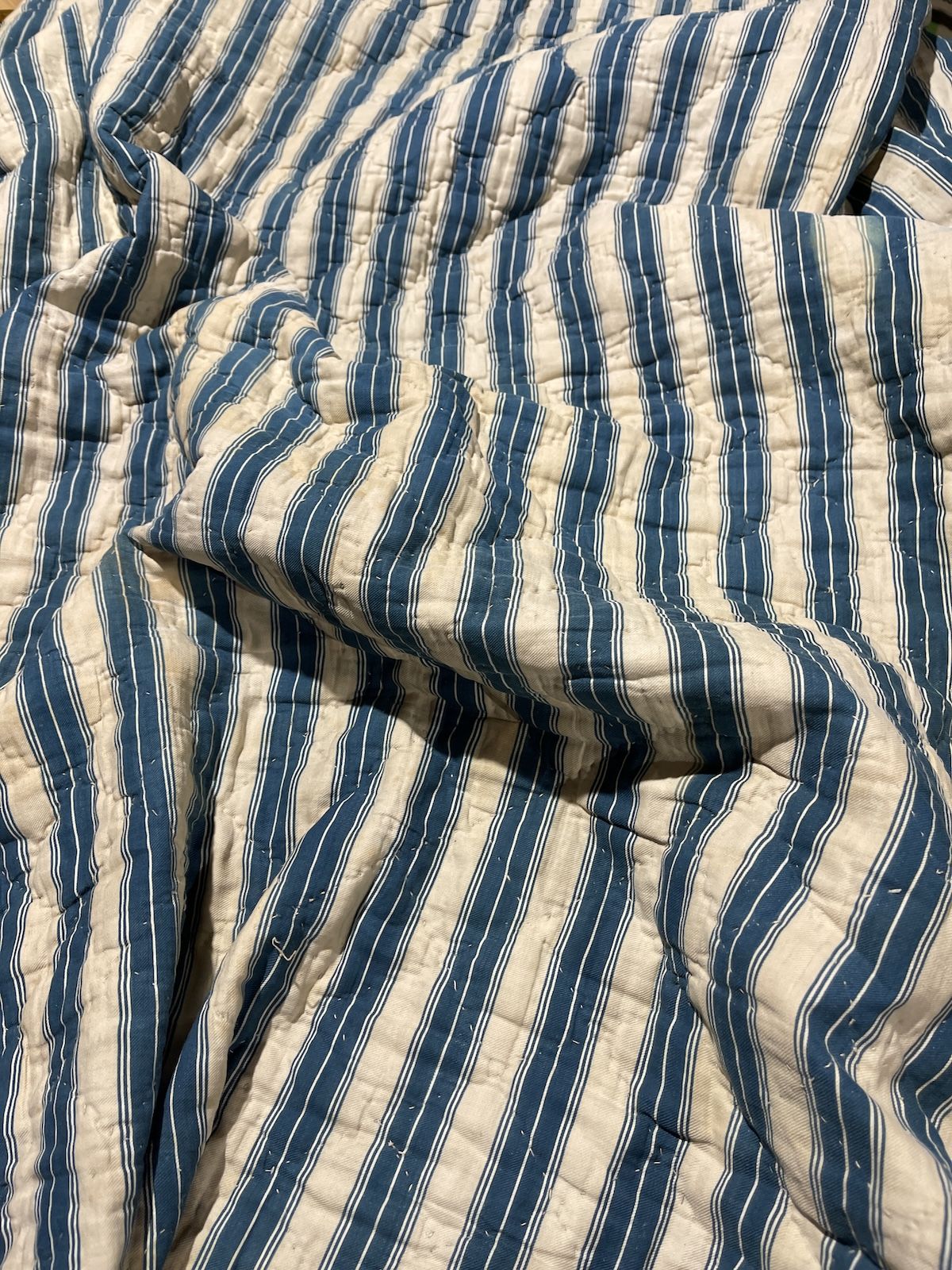 "Couverture Piquée XIXème Rayures Bleu Et Beige région Bordelaise" Ravissante Couverture Piquée –