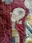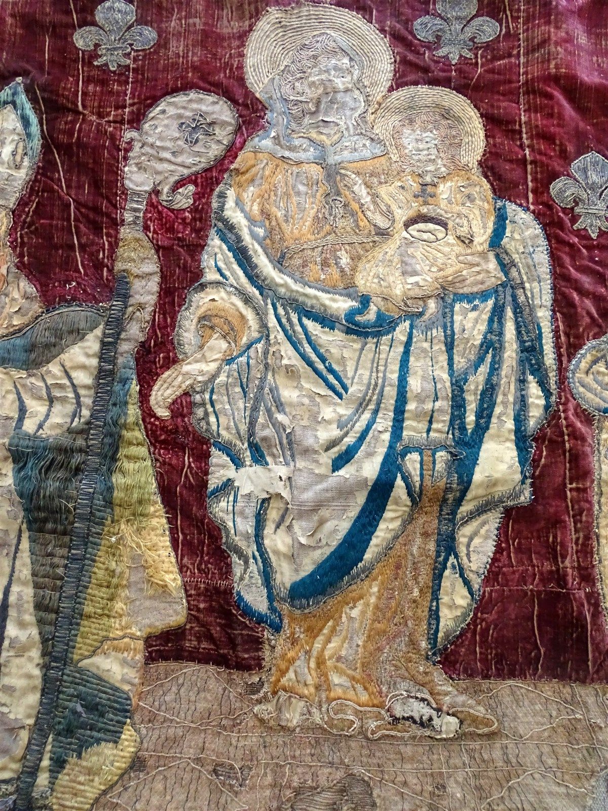 Rare tapisserie époque Gothique, XVème siècle. Fleurs de lys brodées sur velours rouge.