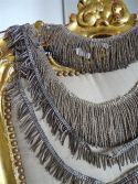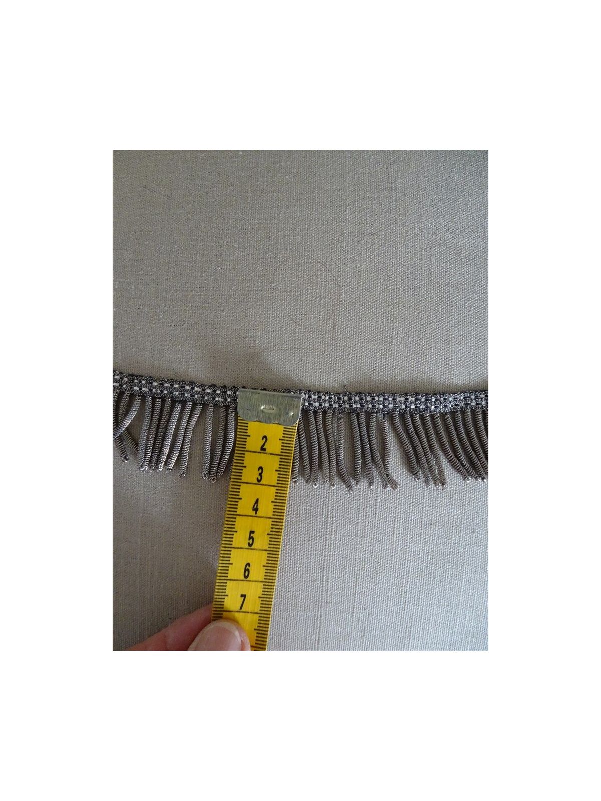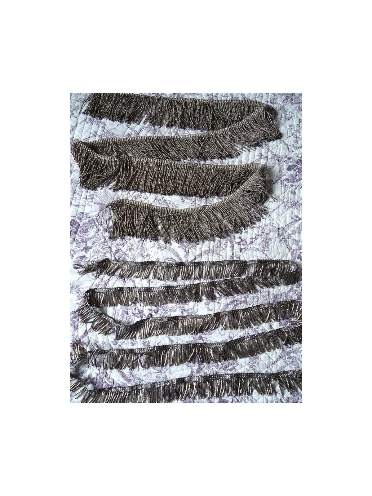2 fragments de trés rares et riches franges en fils d'argent métallique. Splendide et élégante passementerie époque XIXème à la patine parfaite . Vous allez adorer décorer , tabourets anciens, bordures de riches coussins , bordures de tentures, d'embrases et également agrémenter vos sacs , chapeaux , abat jour de lampes ainsi que vos vêtements . Ces franges d'un autre temps sont en excellente condition. Dimensions : 144 cm x 6.5 cm and 217 cm x 3 cm