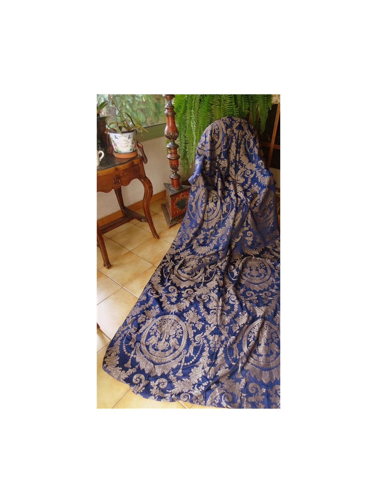 Magnifique paire de tentures en soie Lyonnaise. Bleu marine et décor floral gris argent. Epoque XIXème.