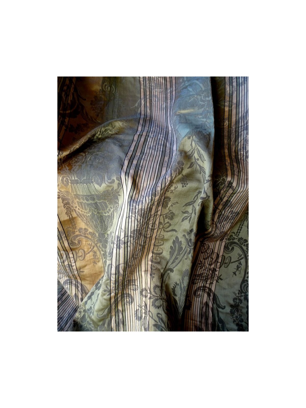 Trés beaux rideaux anciens époque Charles X.XIXème siècle. Belle couleur verte et beige/ miel. Ces tentures sont doublées de toile.