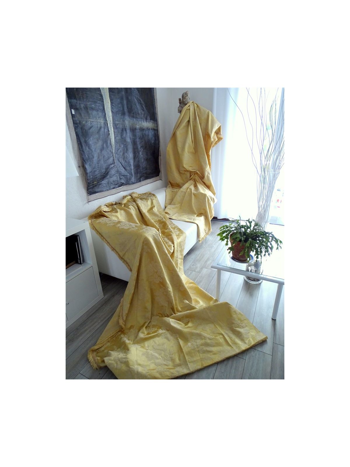 "Paire De Tentures En Soie Damassée De Couleur jaune beige Dorée Et Ivoire" Ravissante paire de tentures époque XXème.